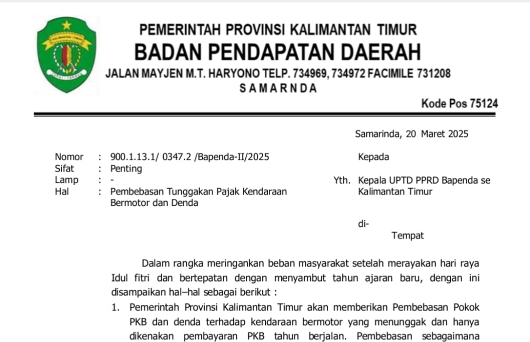Inspirasimedia.com, SAMARINDA – Kabar gembira bagi pemilik kendaraan bermotor di Kalimantan Timur. Pemerintah Provinsi (Pemprov) Kaltim resmi mengeluarkan kebijakan pembebasan pokok Pajak Kendaraan Bermotor (PKB) dan denda bagi kendaraan yang menunggak.